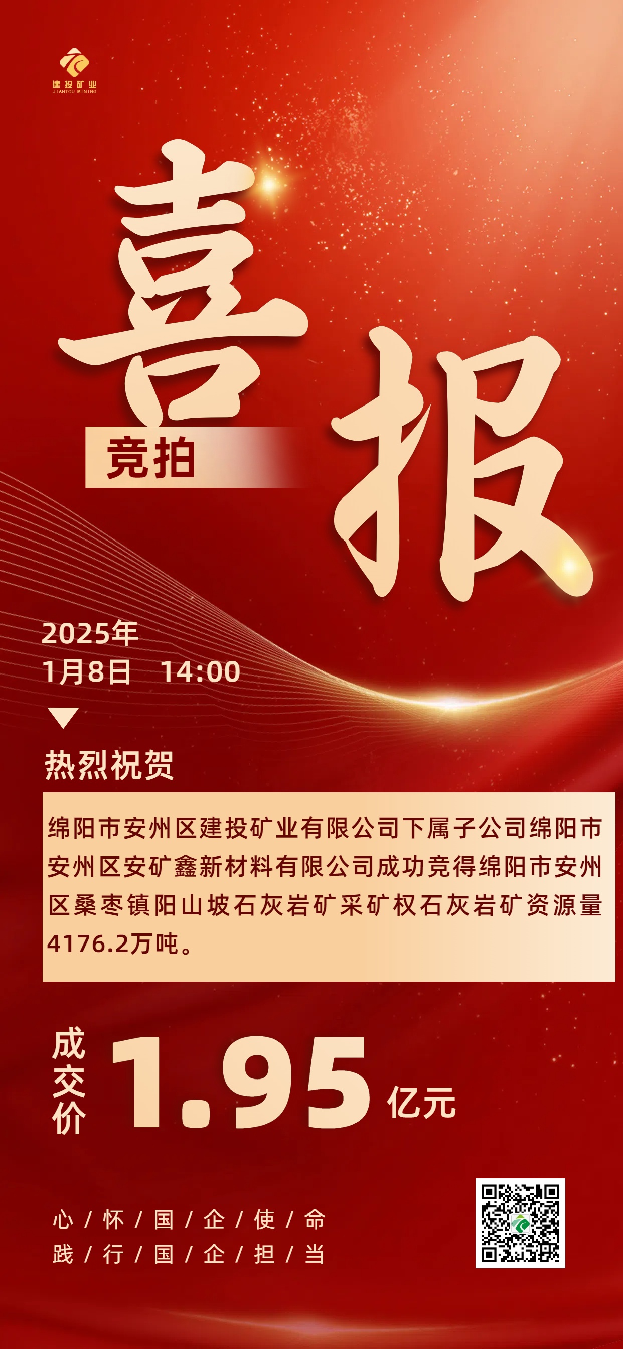 喜報|綿陽安州礦產(chǎn)資源集團有限公司下屬子公司綿陽市安州區(qū)安礦鑫新材料有限公司成功競得綿陽市安州區(qū)桑棗鎮(zhèn)陽山坡石灰?guī)r礦采礦權(quán)
